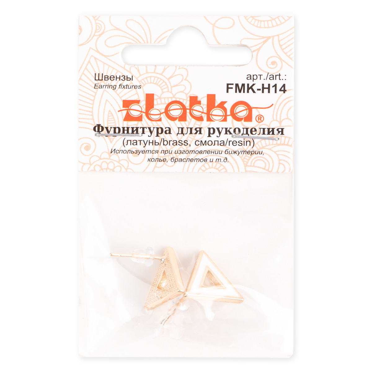 Швензы ТМ " Zlatka" арт. FMK- H14 Аккуратные швензы - гвоздикитреугольной формы, прекрасно подойдут для создания Ваших уникальных сережек. Серьги минимализм подходят для повседневной носки, а также эффектно дополнят нарядный, вечерний, праздничный или свадебный образ. Швензы имеют креплеие для подвесок, изготовлены из латуни, не темнеют, не окисляютя. Размер: 12х14 мм. Количество в упаковке: 2 шт. Сообщить о неточности в описании